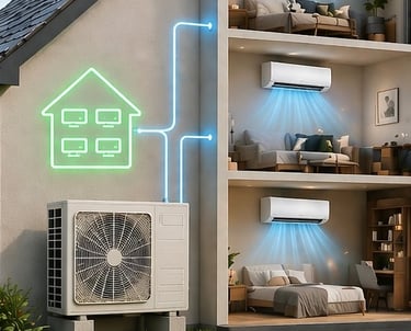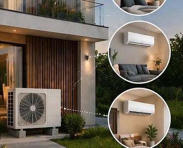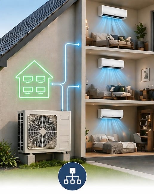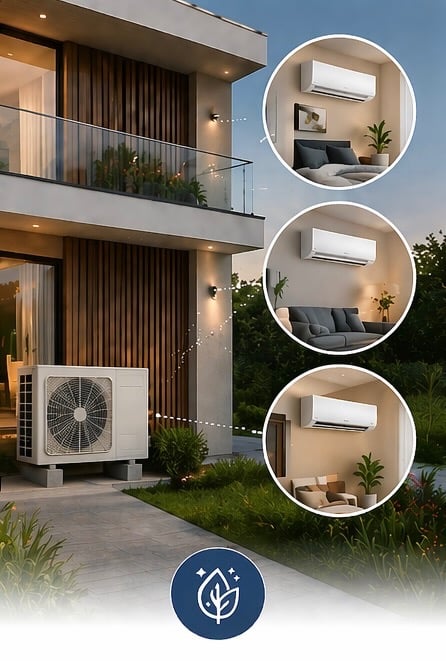 Tek bir dış ünite ile birden fazla odanın iklimlendirilmesini sağlayarak dış cephedeki görüntü kirliliğini önler. Her oda için bağımsız kontrol imkanı sunan bu sistemler, alan tasarrufu ve estetiği bir araya getirir.